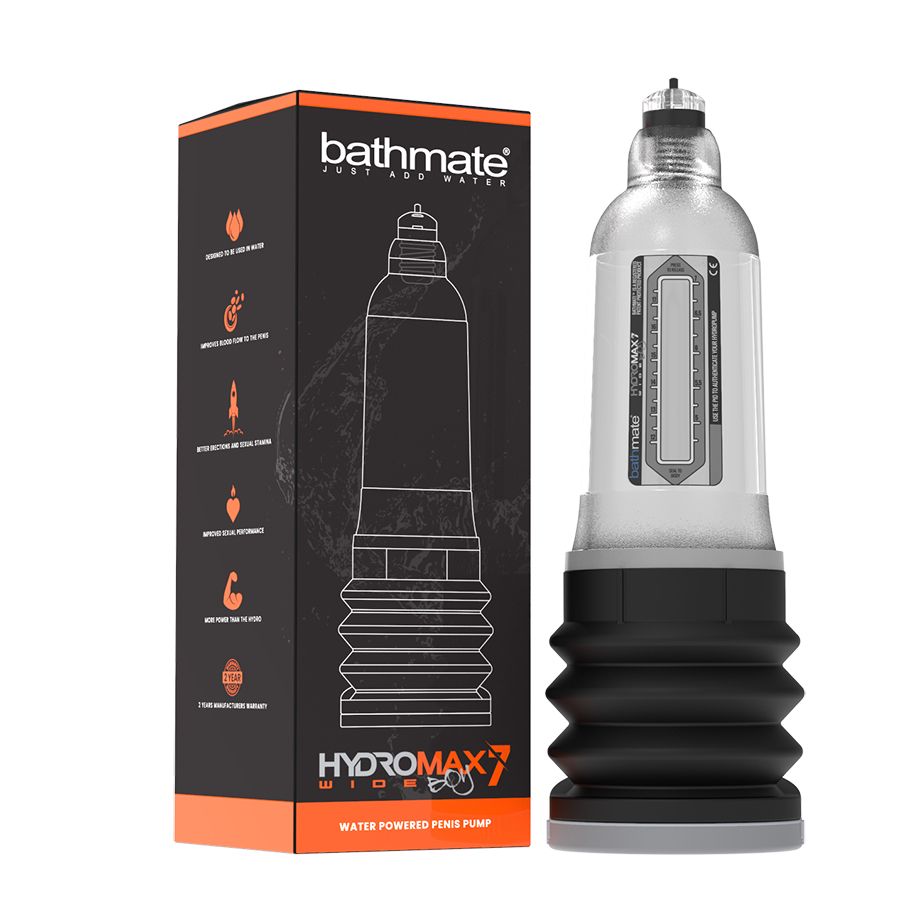 Bathmate HYDROMAX7 Wide Boy — модель увеличенного диаметра, разработанная специально для мужчин с большим обхватом пениса. Гидропомпа Bathmate использует воду в качестве рабочей среды при создании разрежения вокруг полового члена. Помпа безопасна, не оставляет синяков и растяжений, проста в использовании. Она удобно крепится на основании пениса и создаёт достаточное давление для эффективных тренировок, не требуя постоянной подкачки.