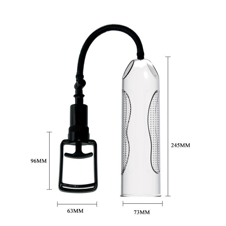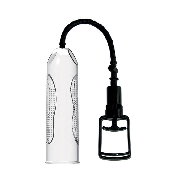 Помпа выполнена из пластика и термопластической резины, представляет собой прозрачную колбу с пупырышками внутри, на которую надето мягкое и эластичное кольцо. Работает очень просто - половой орган помещается в колбу, а воздух выкачивается за счет рычага на шланге. К пенису начинает активно приливать кровь, возбуждая его, питая и делая крупнее.