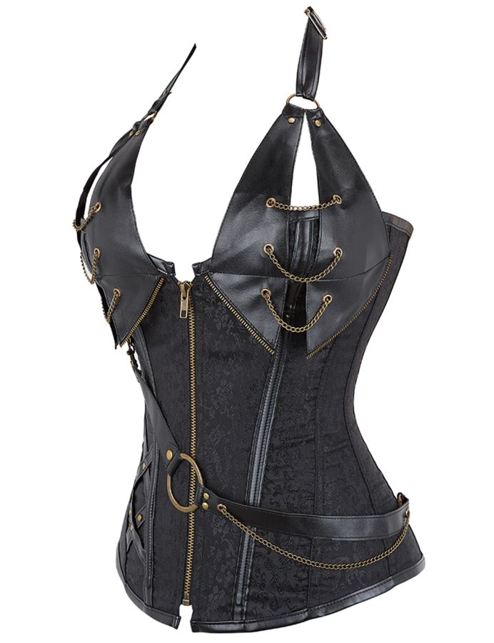 Кожаные вставки и металлические элементы создают гармоничный контраст текстур. На передней части расположен стильный замочек-молния, дополненный регулируемым ремешком для идеальной посадки. Цепочки, ниспадающие на грудях, подчеркивают форму и добавляют образу динамики.
