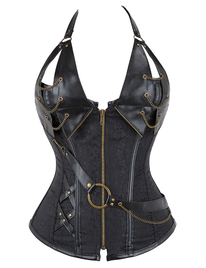 Этот дерзкий корсет в насыщенном черном цвете станет центром внимания любого образа. Модель с эффектной шнуровкой на спине и декоративными цепями на груди сочетает в себе эстетику фетиш-стиля и утонченную сексуальность. Корсет фиксируется на шее, создавая соблазнительный силуэт с открытой спиной.