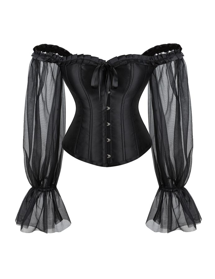 Длинные прозрачные рукава, выполненные из легкого, тонкого материала, придают корсету особенную воздушность и утонченность. Они мягко ниспадают вдоль рук, создавая эффектность и подчеркивая изящество ваших движений. Такой дизайн идеально сочетает в себе дерзость и элегантность, делая корсет универсальным для разных мероприятий.