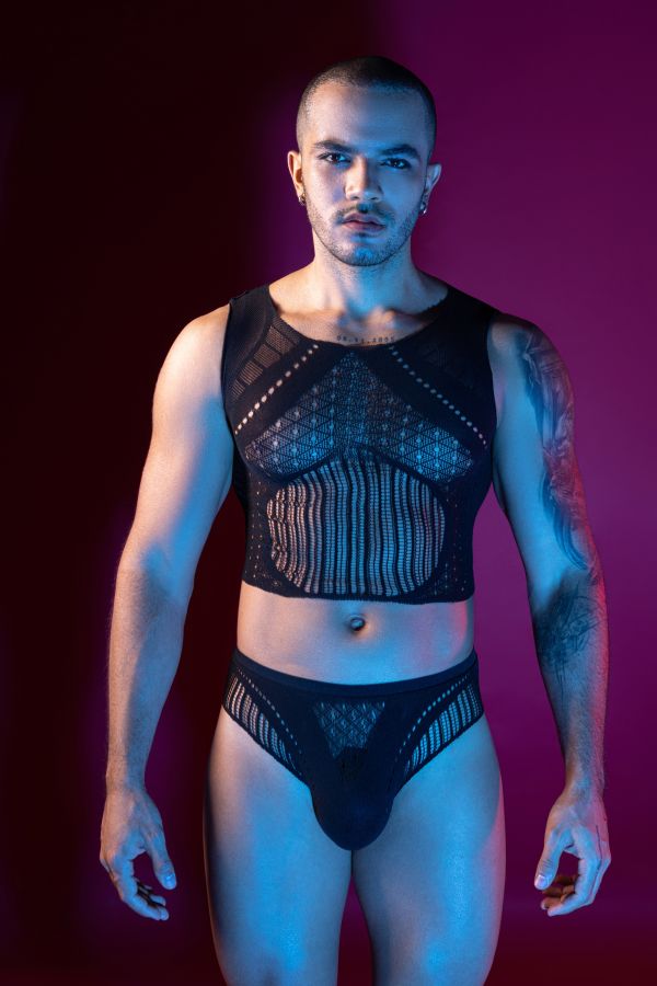 Эффектный мужской комплект из эластичной полупрозрачной сетки с геометрическим узором — выбор для смелых и уверенных в себе. Кроп-топ с архитектурным дизайном подчёркивает грудь, плечи и талию, создавая выразительный и современный силуэт. Трусы с акцентными вставками гармонично дополняют образ, выгодно подчёркивая форму и линии тела.