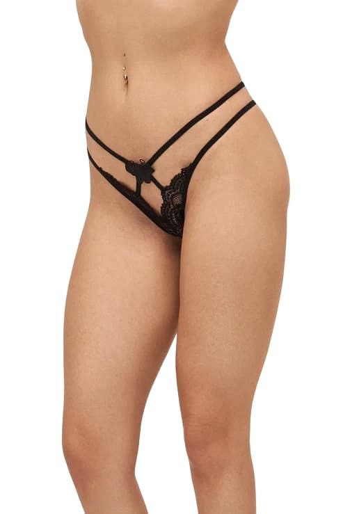 Сексуальные трусики-стринги с двойным эластичным пояском, спереди украшены игривой бабочкой. Нежное кружево непременно будет притягивать мужской взгляд.
