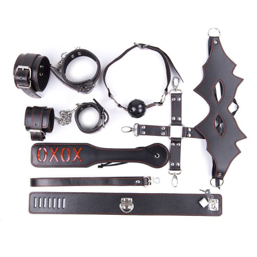 Черный стильный набор с красной строчкой из 7-ми прдметов для игр: Наручники, наножники: кляп с шариком, маска на глаза, ошейник с поводком, шлепалка и фиксатор для наручников.