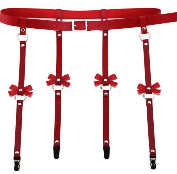 Изысканная кожаная портупея с подвязками для чулок. Подвязки украшены аккуратными бантиками из эко-кожи. Длина подвязок 38 см., не регулируется.